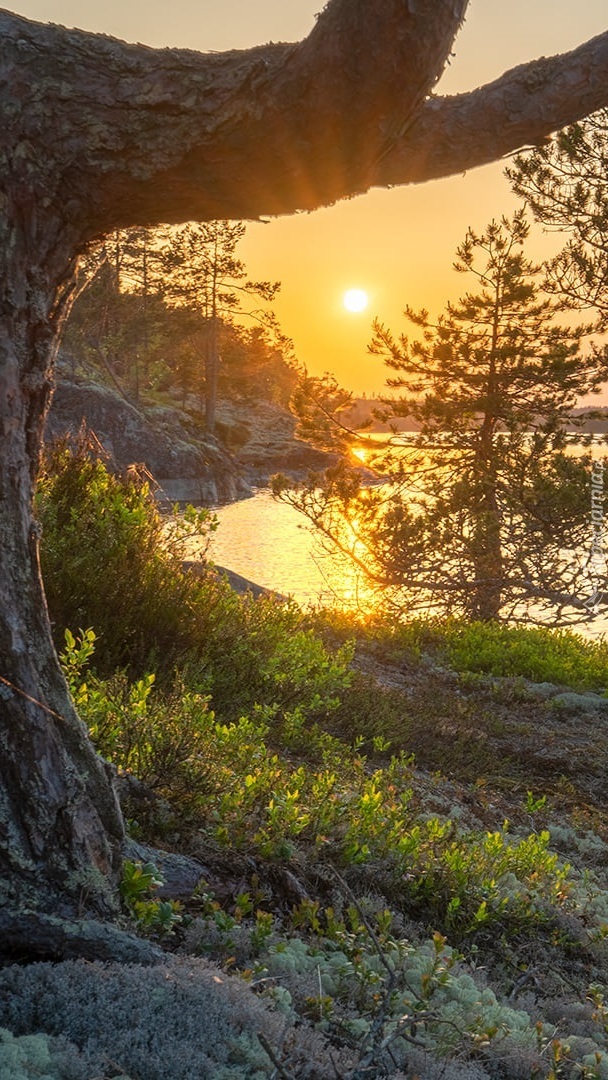 Edytor tapety: Drzewa nad jeziorem w porannym słońcu