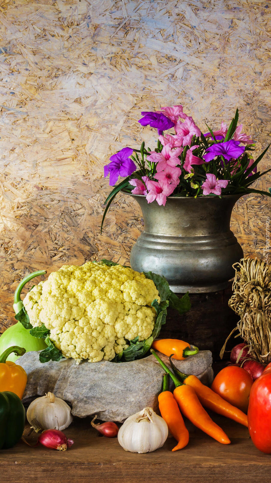 Edytor tapety: Warzywa obok kwiatów w dzbanie