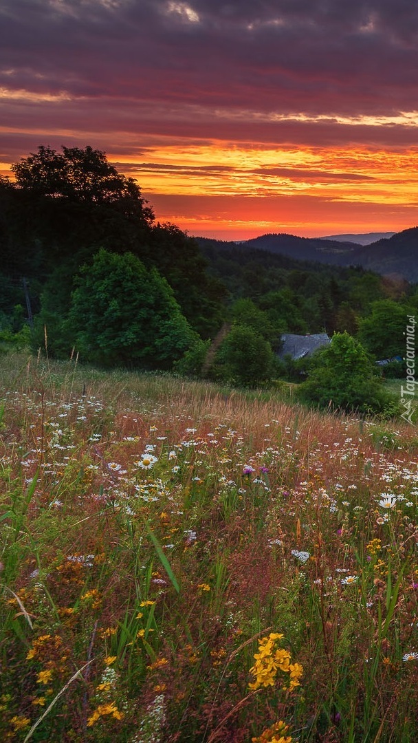 Edytor tapety: Zachód słońca nad drzewami i łąką