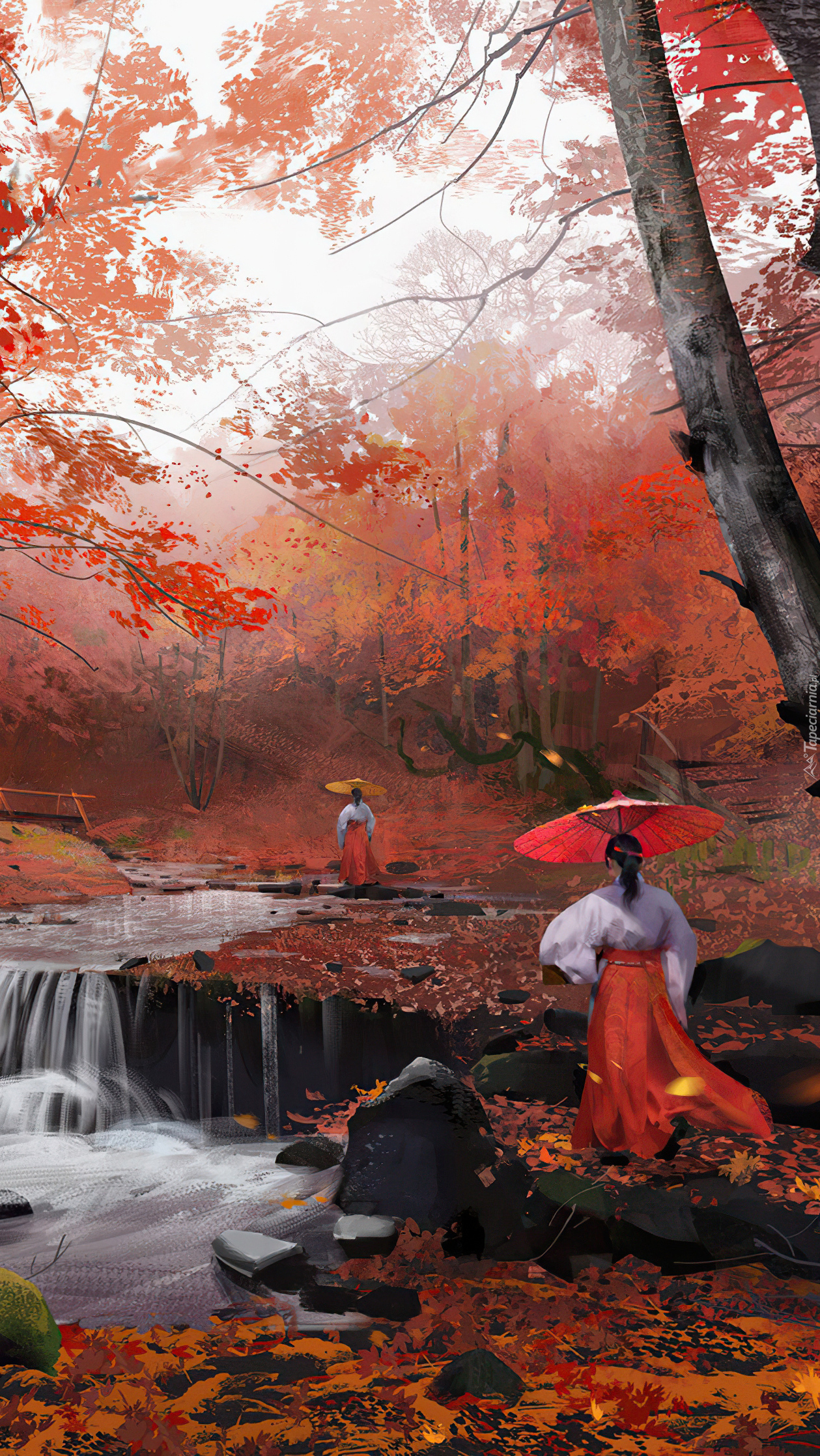 Edytor tapety: Kobiety nad rzeką w jesiennym lesie