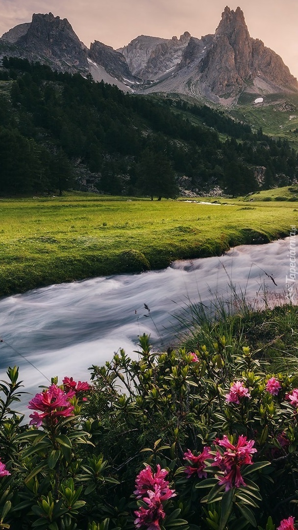 Edytor tapety: Różanecznik nad rwąca rzeką w górach