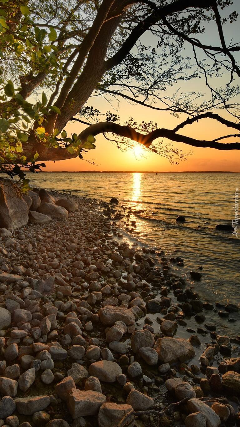 Edytor tapety: Pochylone gałęzie nad brzegiem jeziora