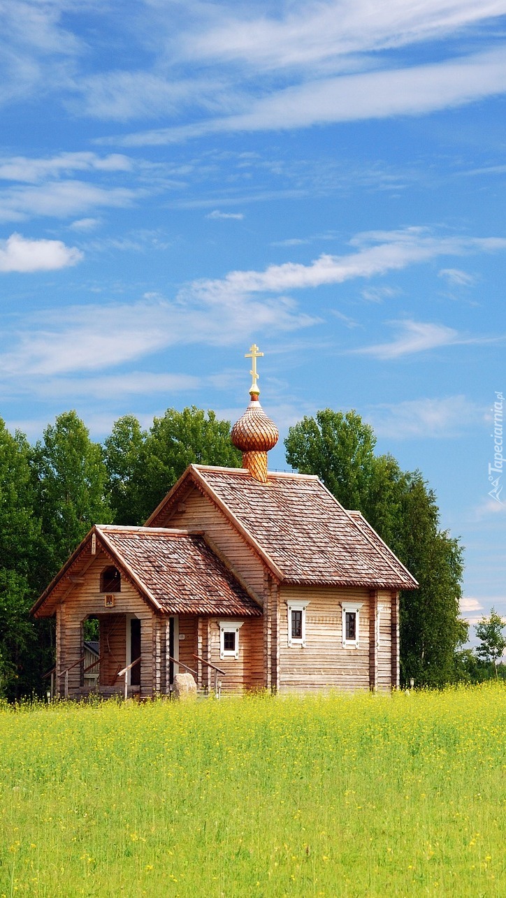 Edytor tapety: Drewniany kościół na łące pod lasem