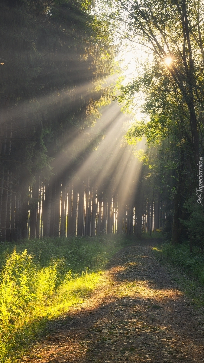 Edytor tapety: Ścieżka wśród drzew w słonecznych promieniach
