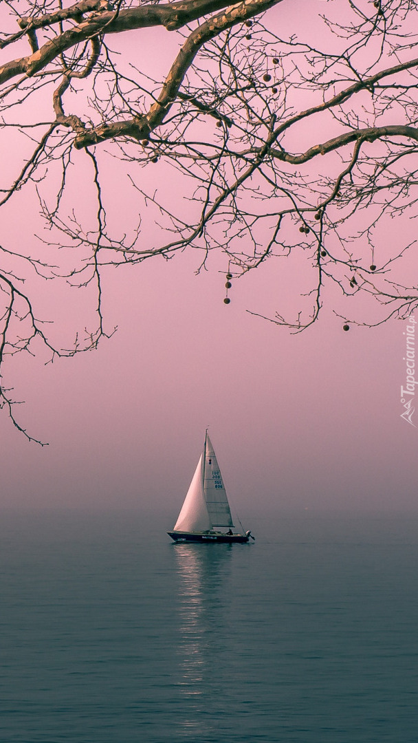 Edytor tapety: Żaglówka na zamglonym o poranku jeziorze