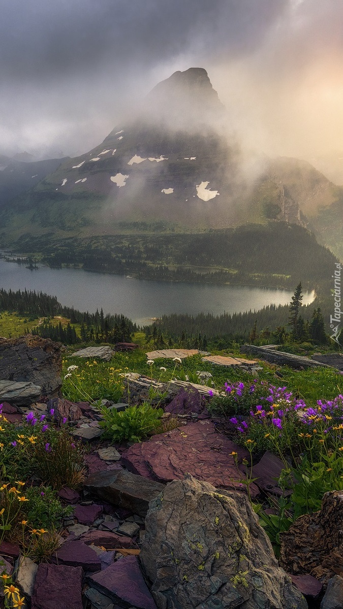 Edytor tapety: Zamglone góry nad jeziorem Hidden Lake