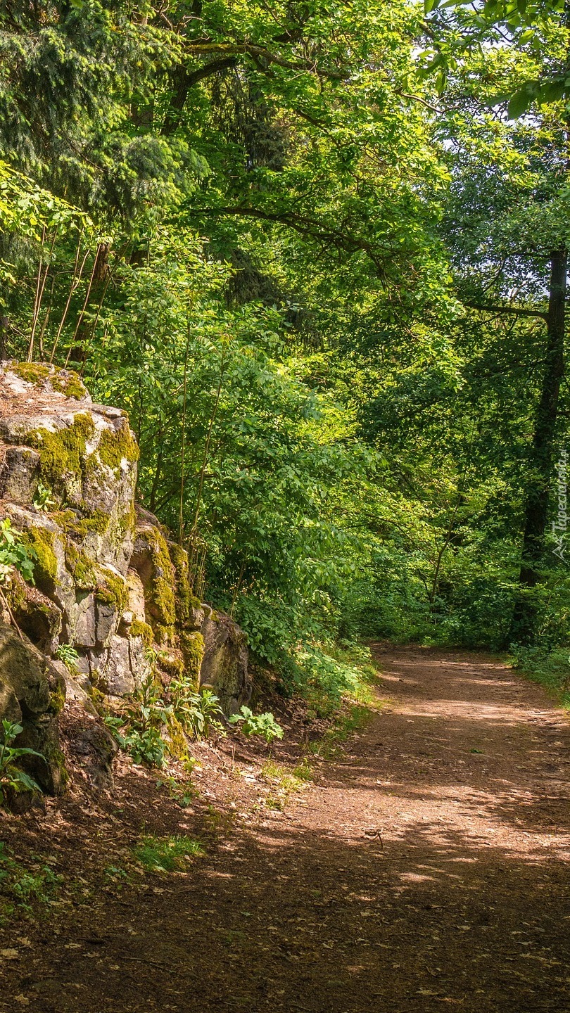 Edytor tapety: Skały i drzewa przy leśnej drodze