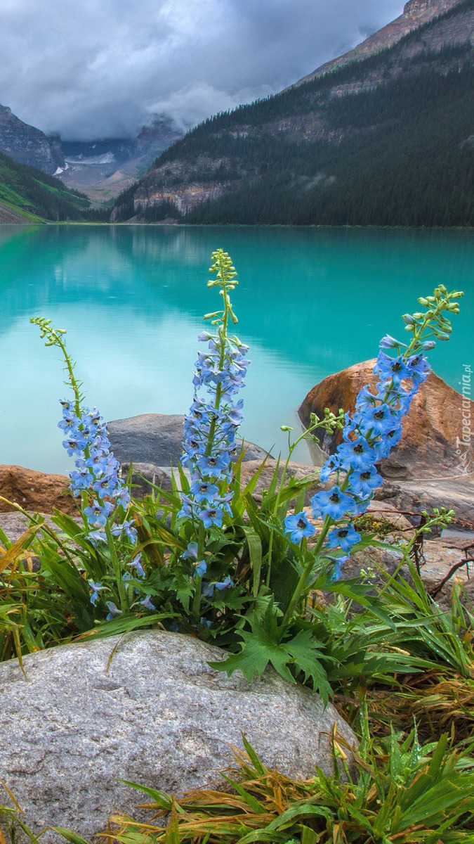 Edytor tapety: Kwiaty na brzegu górskiego jeziora