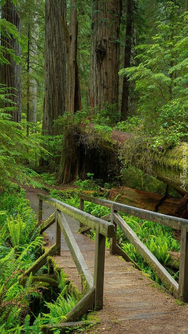 Edytor tapety: Powalone drzewo przy leśnej kładce