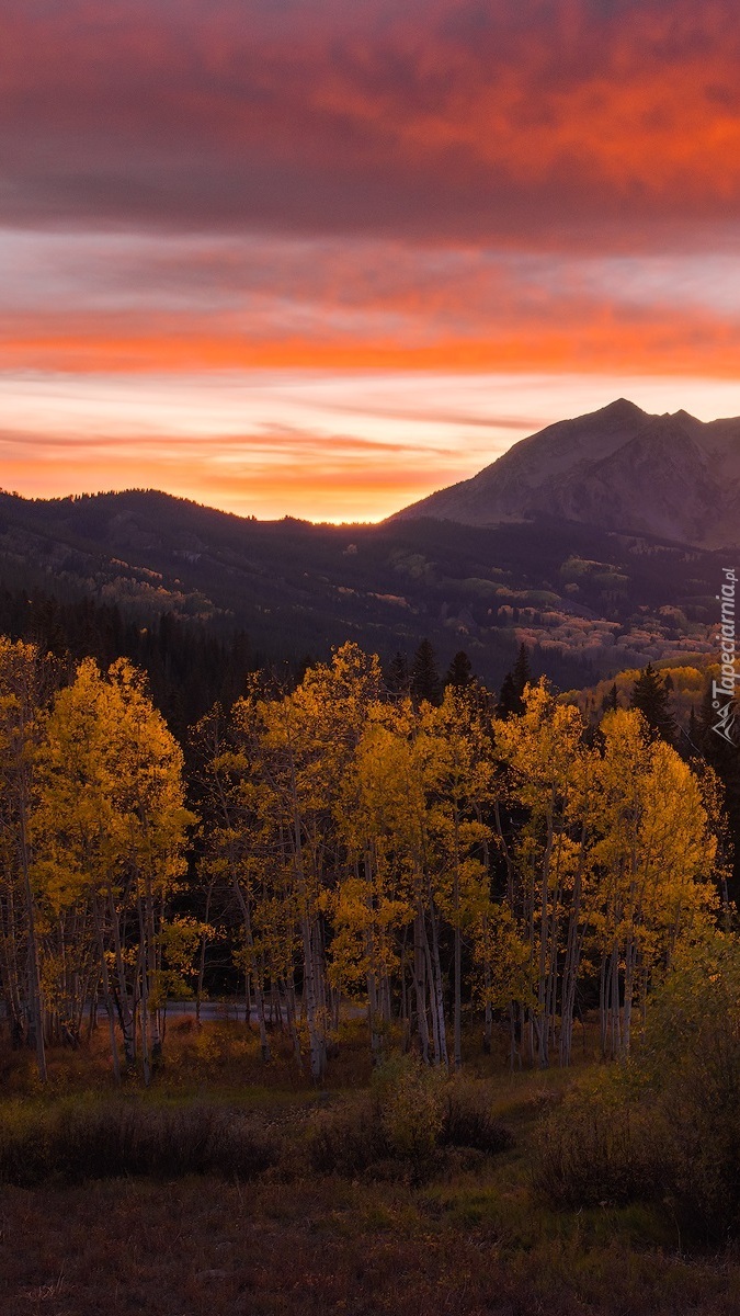 Edytor tapety: Pożółkłe drzewa na tle gór