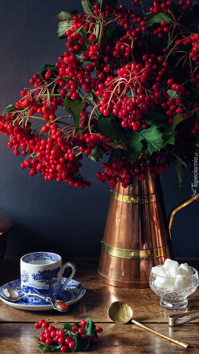 Edytor tapety: Filiżanka obok kaliny w dzbanku