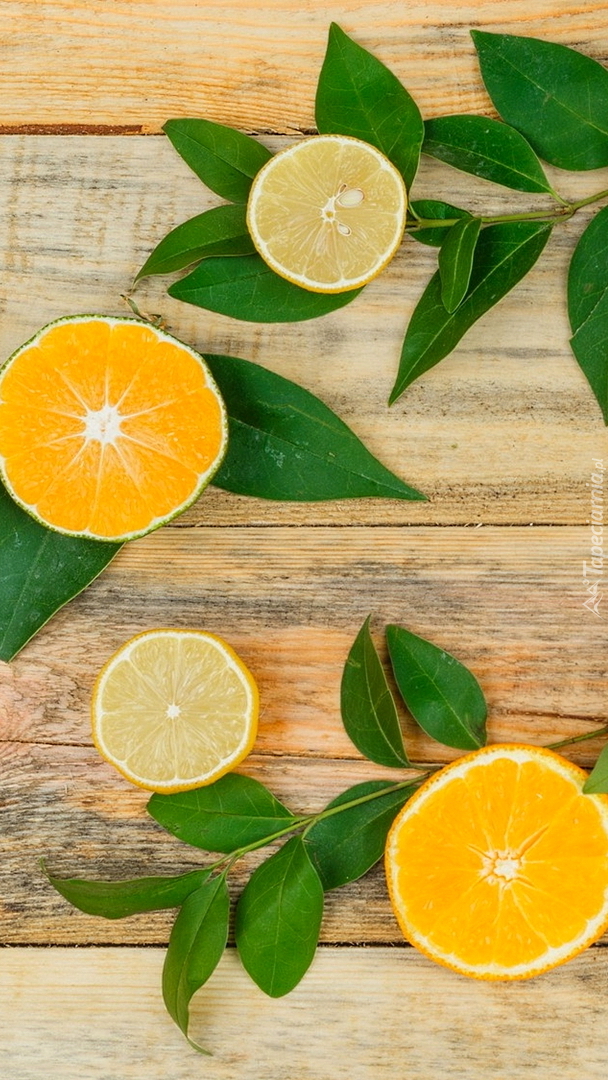 Edytor tapety: Cytrusy i liście na desce