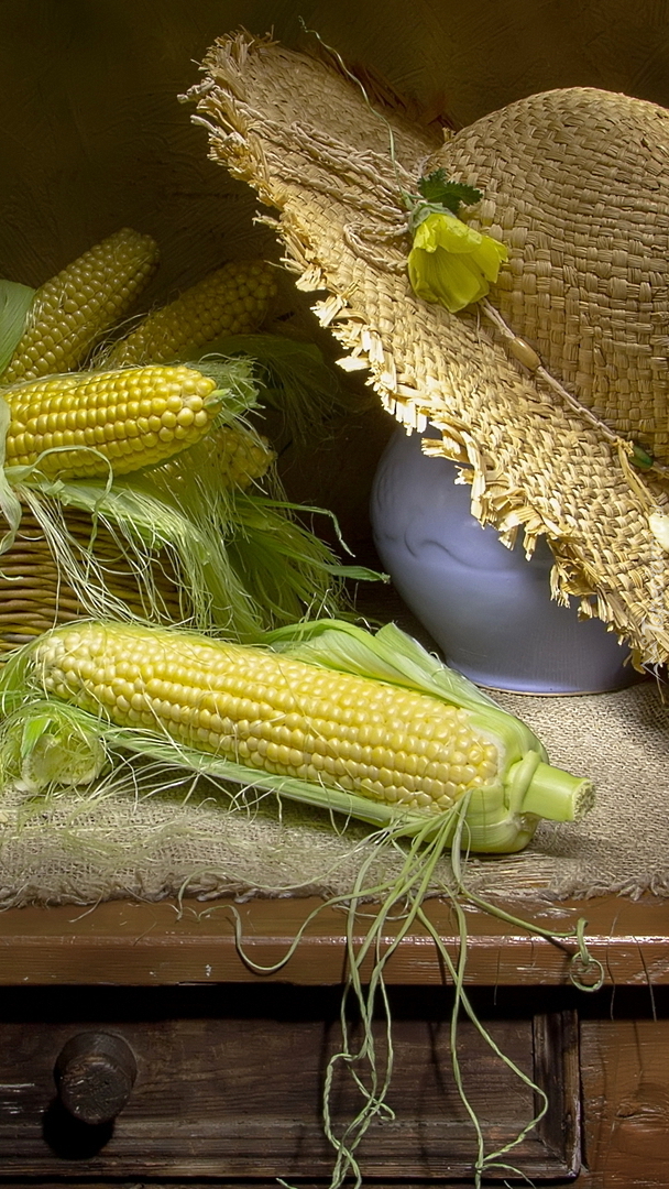 Edytor tapety: Kolby kukurydzy obok kapelusza