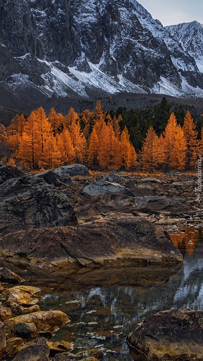 Edytor tapety: Pożółkłe drzewa na skałach w górach