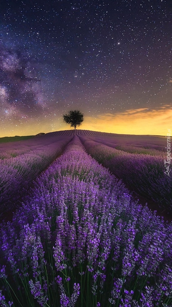 Edytor tapety: Rozgwieżdżone niebo nad lawendowym polem