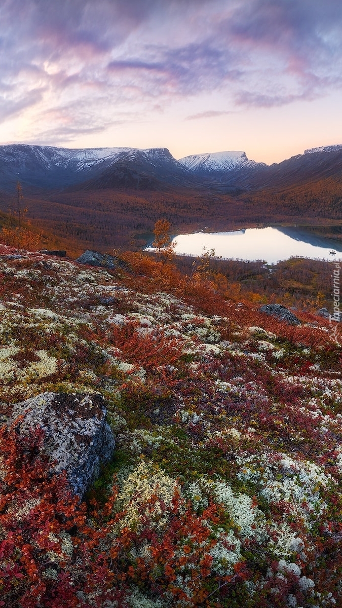 Edytor tapety: Kolorowe rośliny nad jeziorem