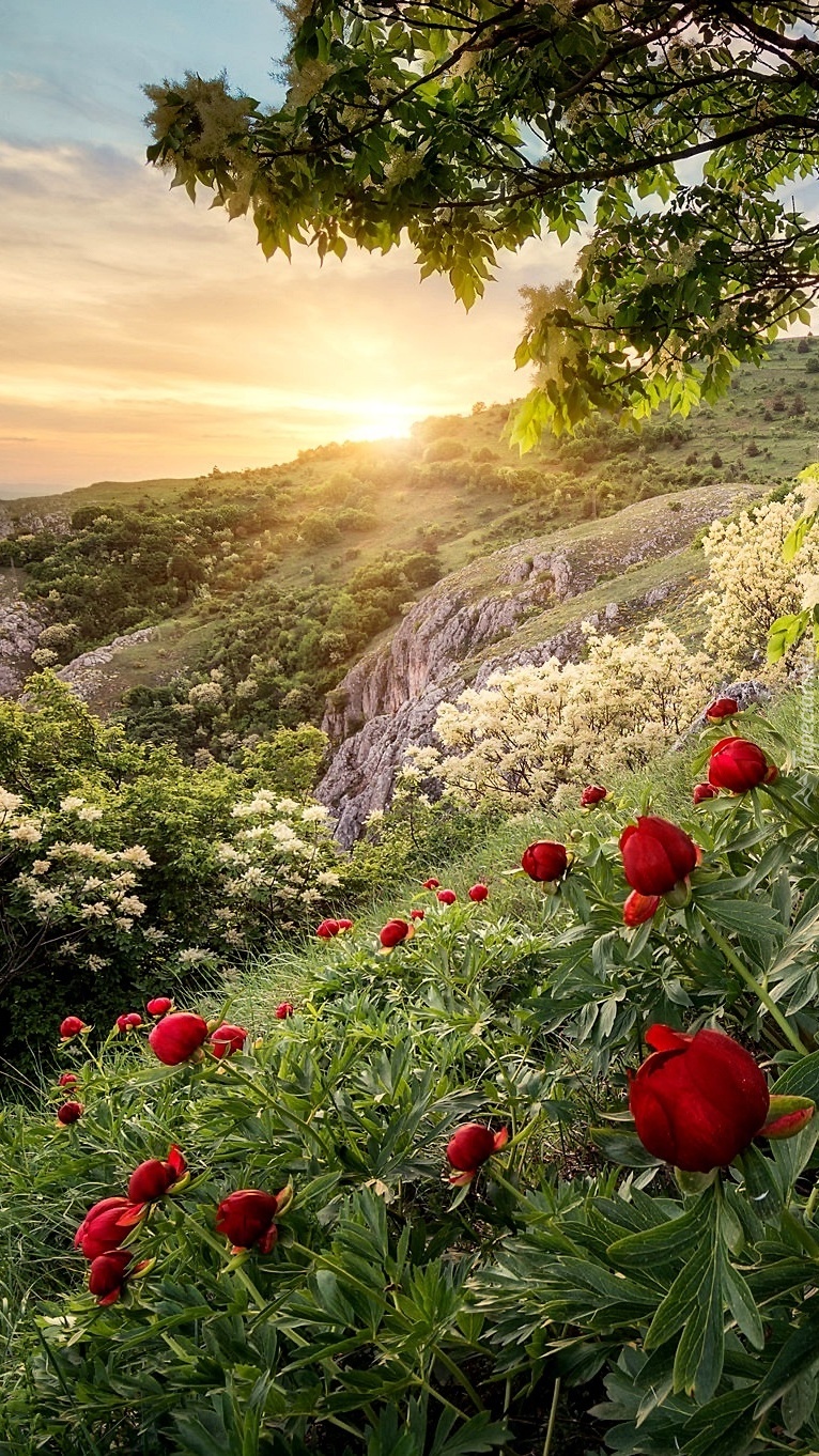 Edytor tapety: Zbocze porośnięte piwoniami