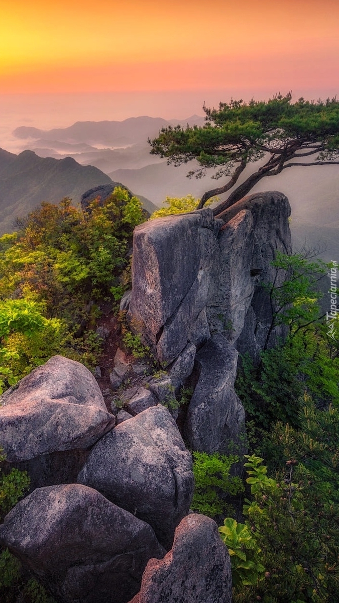 Edytor tapety: Pochylona zielona sosna na skale