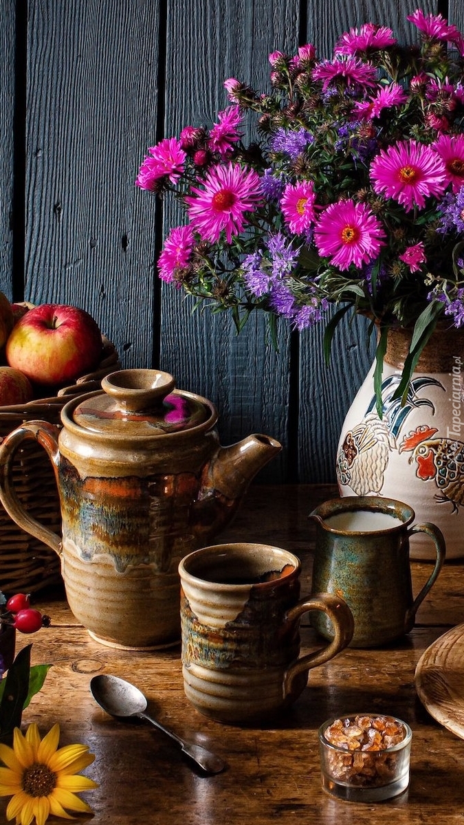 Edytor tapety: Bukiet astrów obok dzbanka