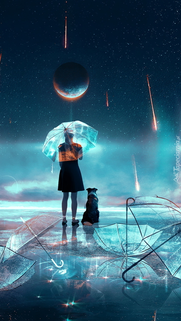 Edytor tapety: Dziewczyna z psem oglądająca spadające meteoryty