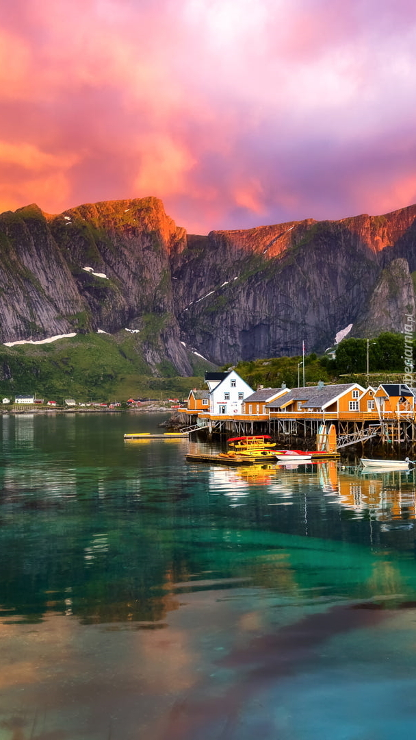 Edytor tapety: Góry Olstinden i wioska Sakrisoya