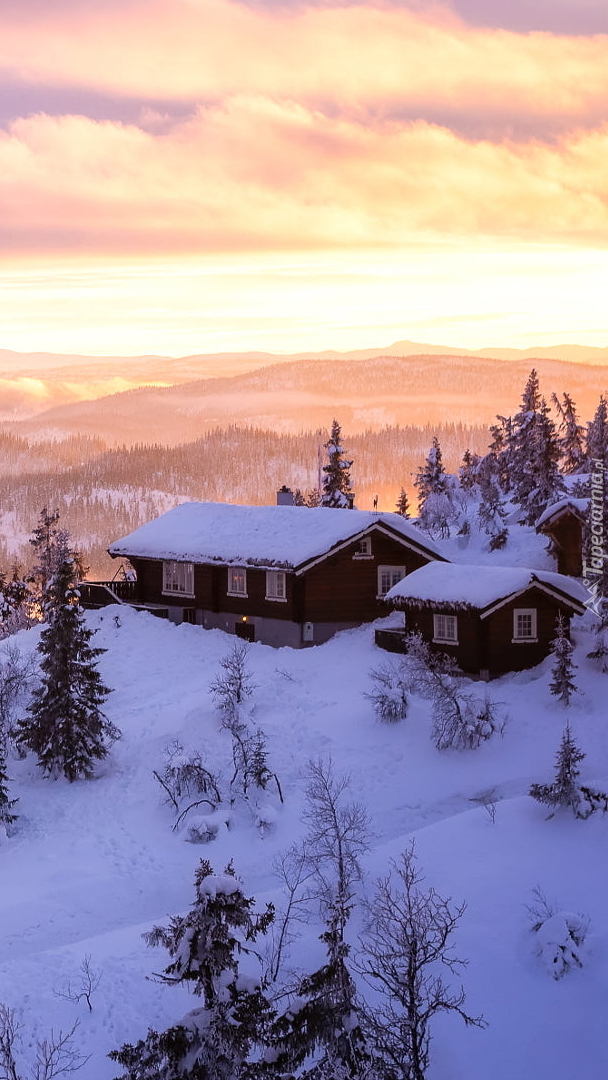 Edytor tapety: Zasypane śniegiem domy na wzgórzu