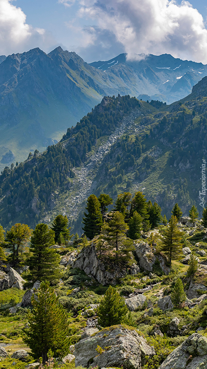 Edytor tapety: Kamienie i drzewa na tle gór