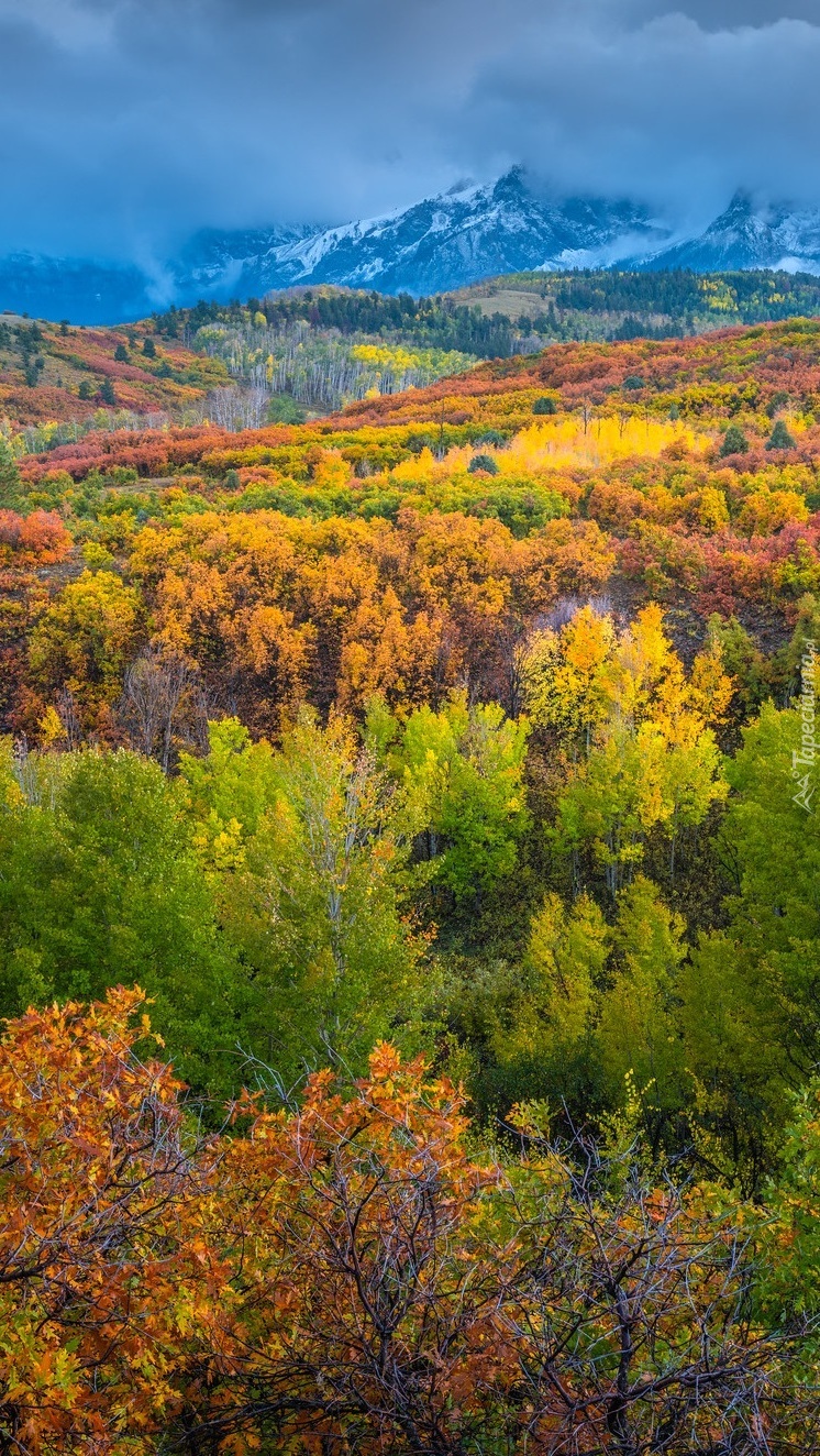 Edytor tapety: Kolorowe drzewa w górach