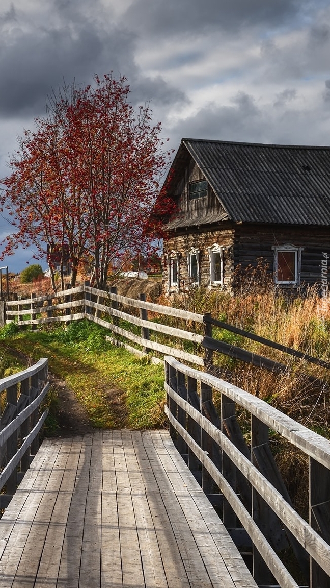 Edytor tapety: Dom i drzewo za ogrodzeniem