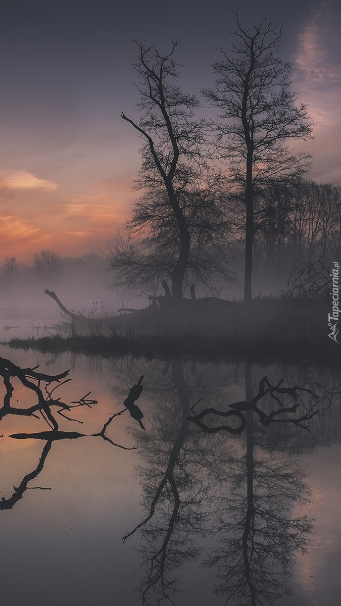 Edytor tapety: Drzewa nad zamglonym jeziorem
