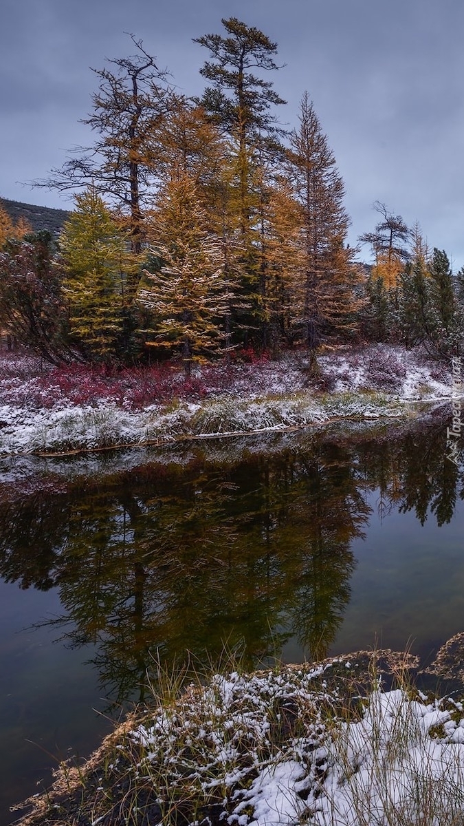 Edytor tapety: Oszroniona trawa pod drzewami nad rzeką