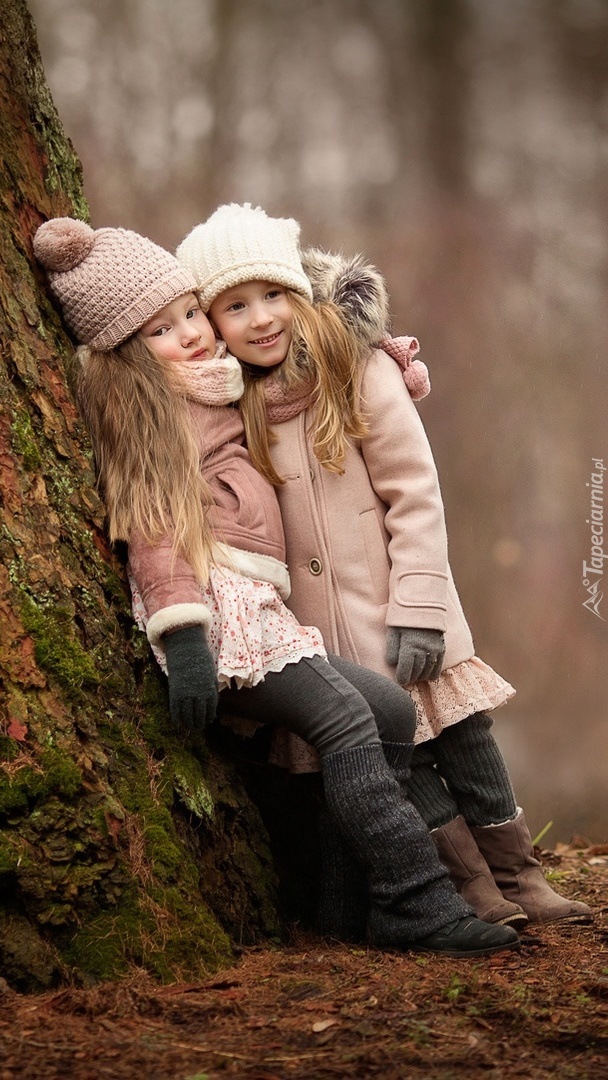Edytor tapety: Pzrytulone dziewczynki opierają się o drzewo