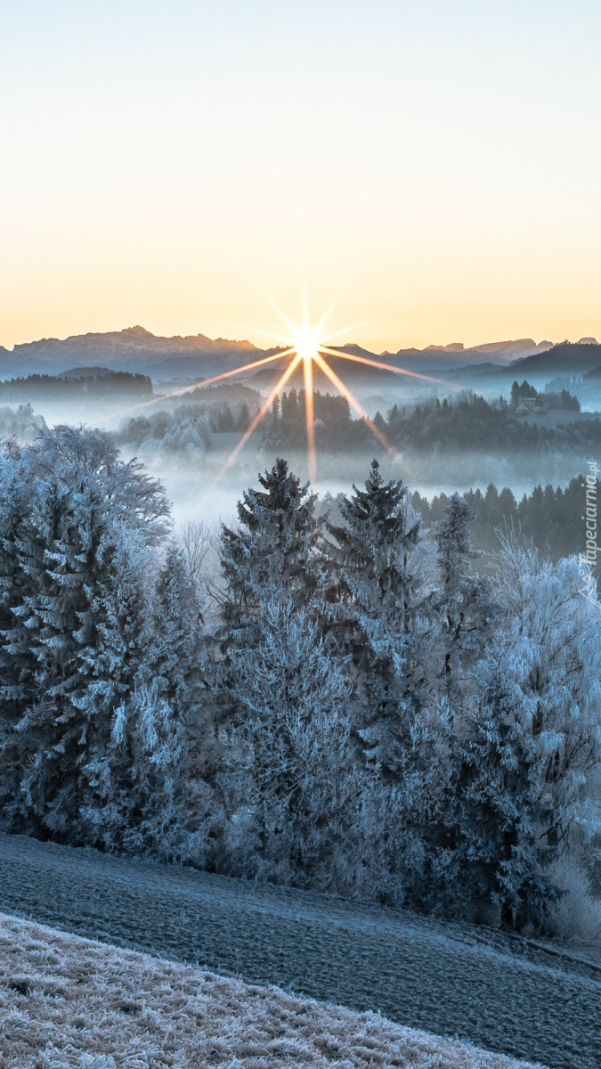 Edytor tapety: Promienie słońca nad oszronionym lasem