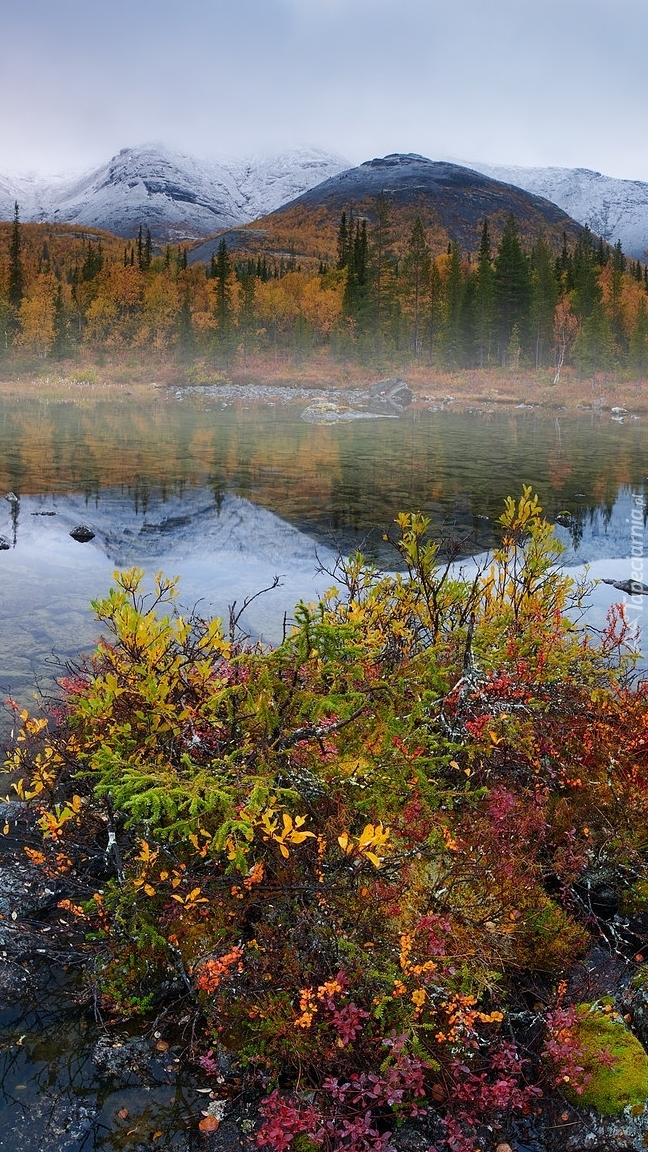 Edytor tapety: Kolorowa roślinność i góry nad jeziorem