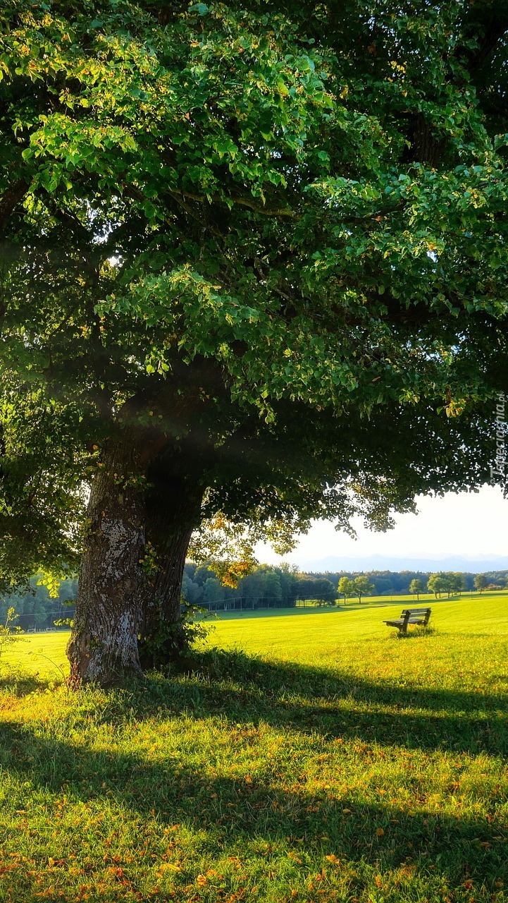 Edytor tapety: Drzewo i ławka na słonecznej łące