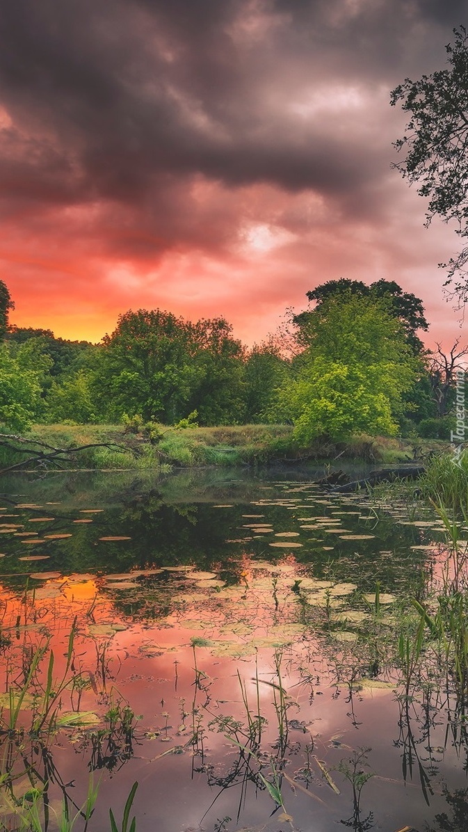 Edytor tapety: Drzewa nad rzeką w zachodzącym słońcu