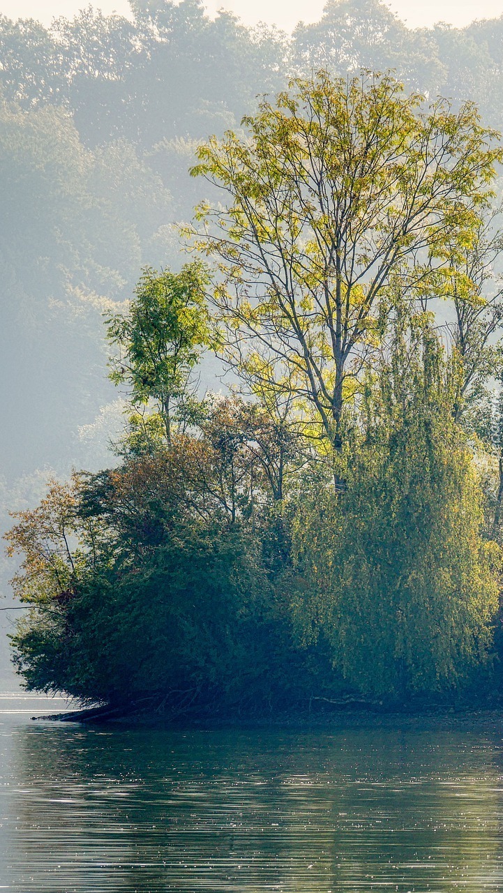 Edytor tapety: Drzewa we mgle nad jeziorem