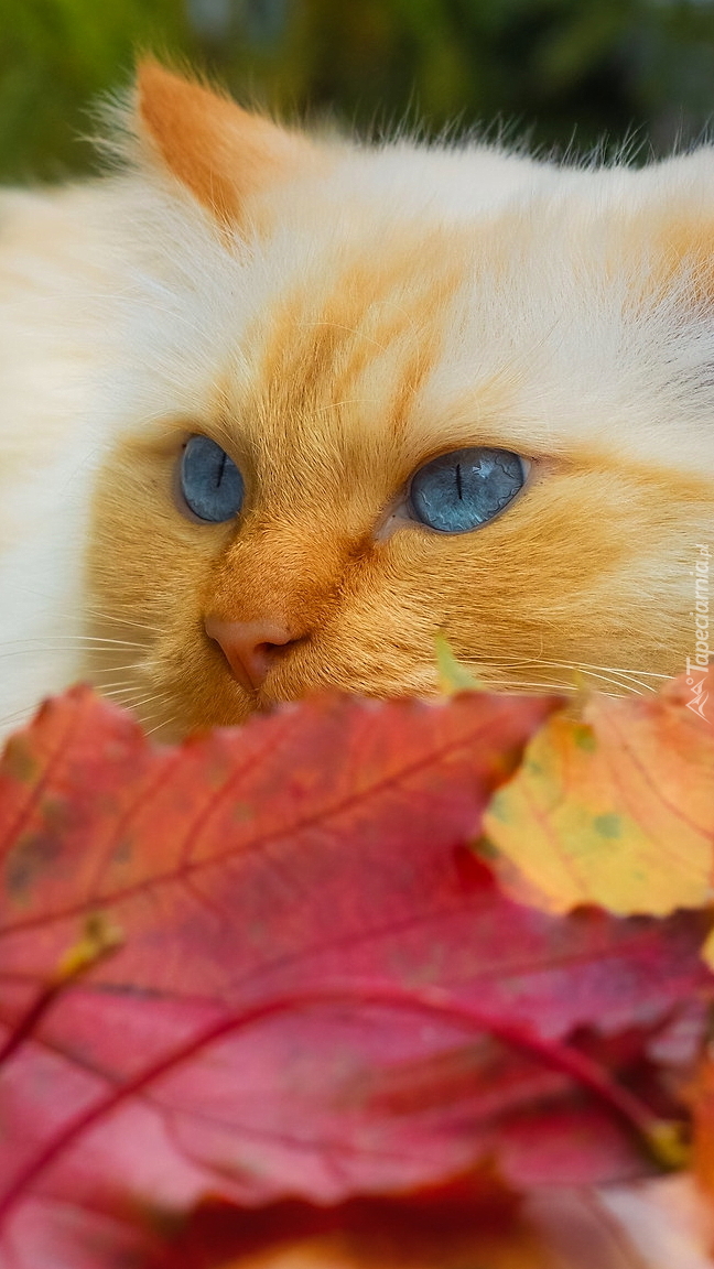 Edytor tapety: Niebieskooki kot obok czerwonego liścia
