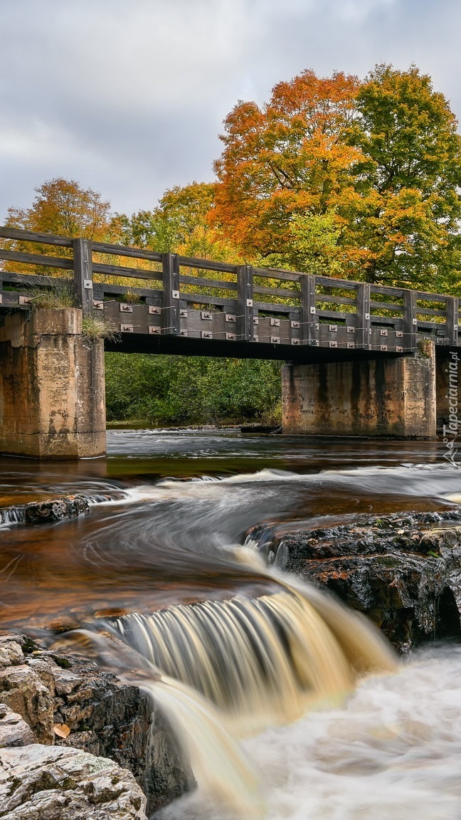 Edytor tapety: Most nad rzeką obok kolorowych drzew
