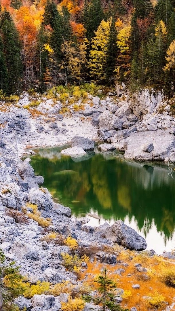 Edytor tapety: Drzewa na skałach nad stawem