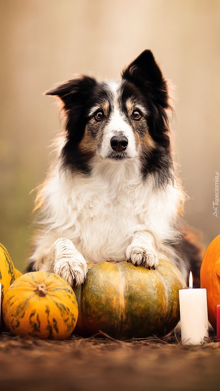 Edytor tapety: Border collie z łapkami na dyniach