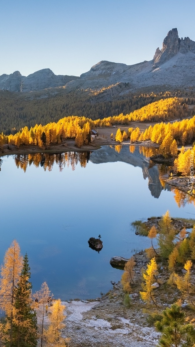 Edytor tapety: Pożółkłe drzewa nad jeziorem w górach