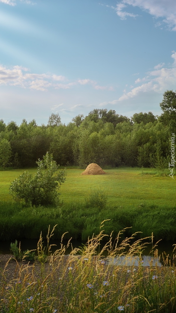 Edytor tapety: Kopka siana na łące pod lasem