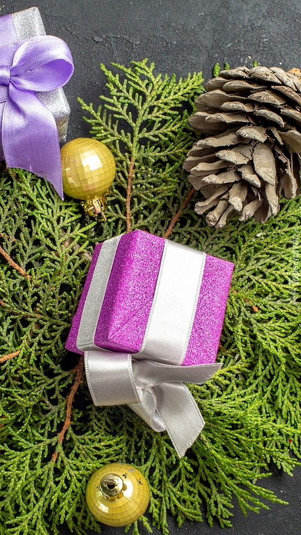 Edytor tapety: Prezenty obok bombek i szyszki