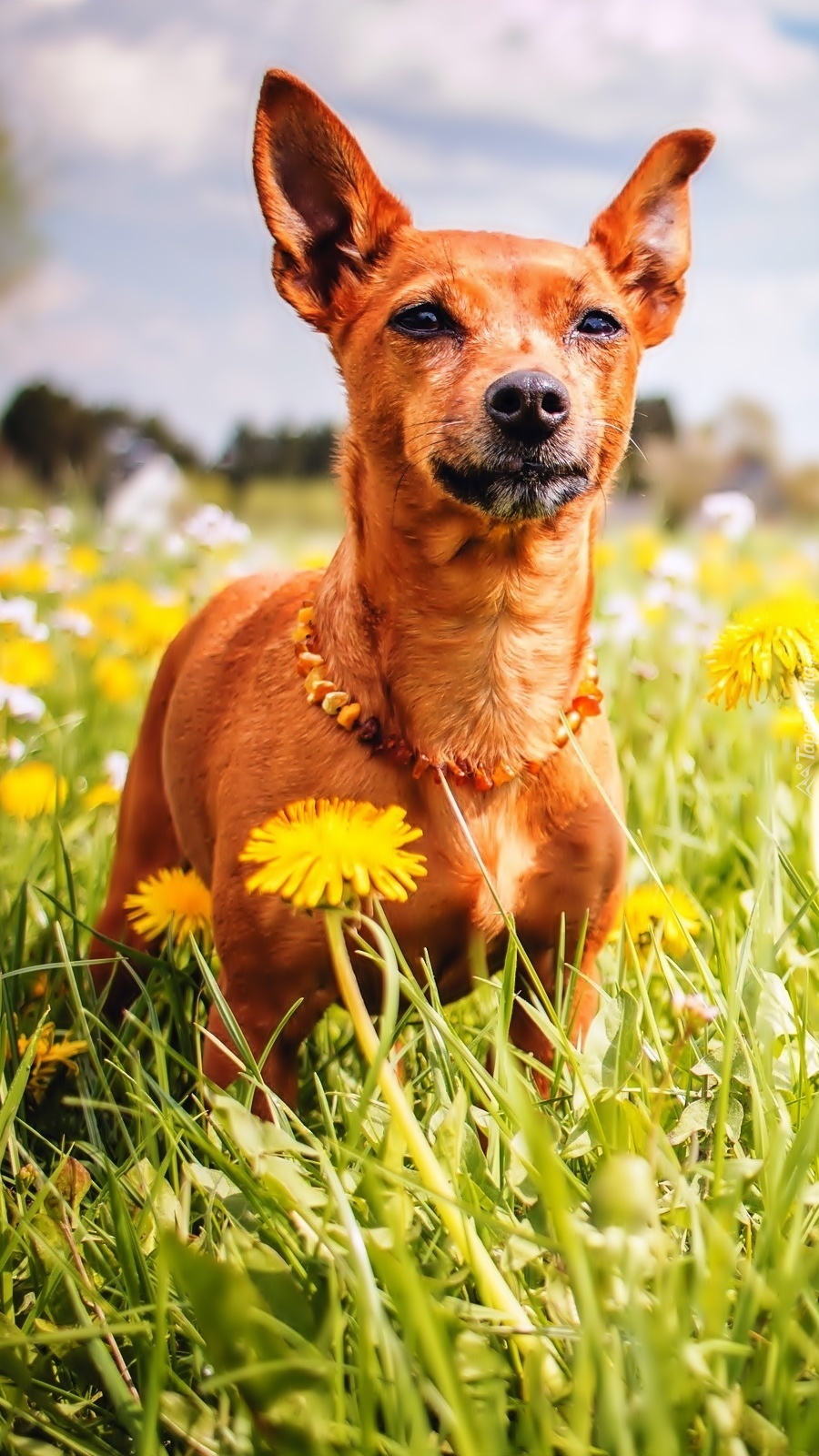 Edytor tapety: Psiak w żółtych mleczach
