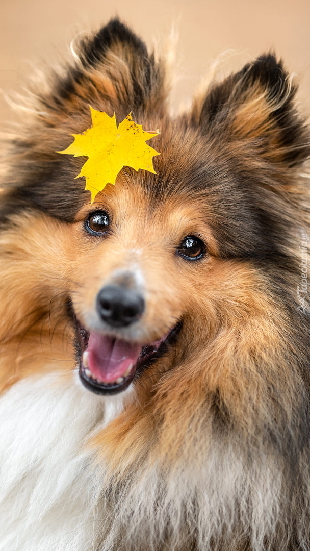 Edytor tapety: Owczarek szetlandzki z liściem na głowie