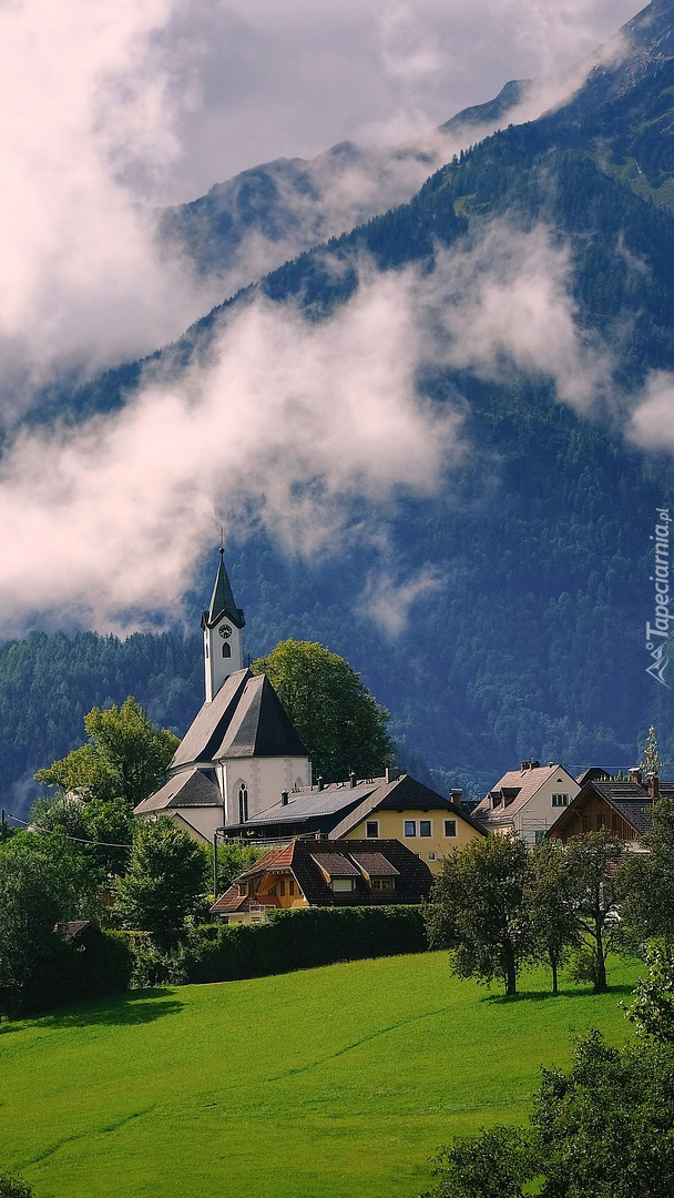 Edytor tapety: Kościół i domy pod zamglonym lasem