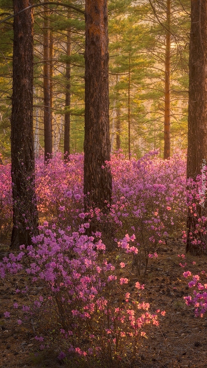 Edytor tapety: Różowe kwiaty w słonecznym lesie