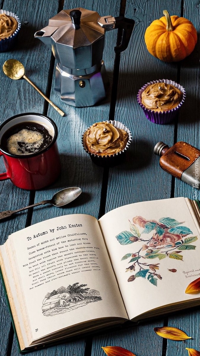 Edytor tapety: Otwarta książka obok babeczek i kubka