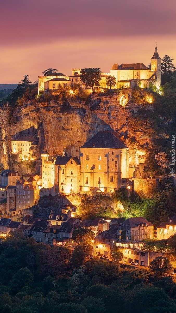 Edytor tapety: Oświetlone domy na skałach w Rocamadour